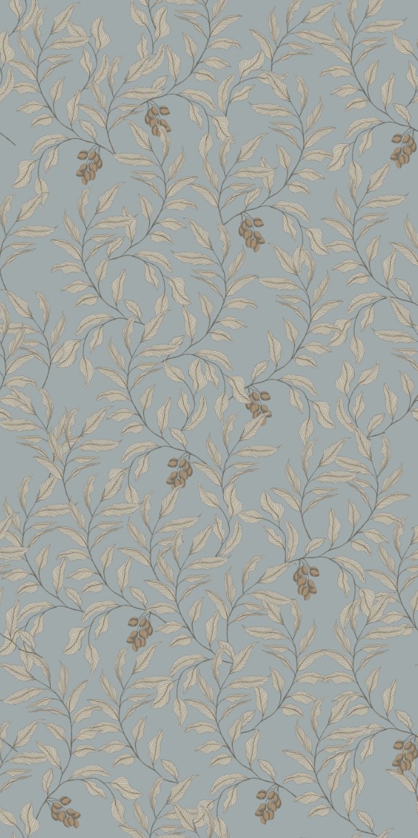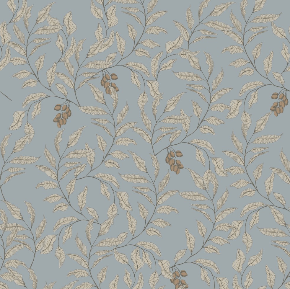 Tapeta w gałązki z listkami na błękitnym tle. Na każdej gałązce jest kiść owoców. Idealna tapeta do kuchnia, jadalni lub spiżarni.
