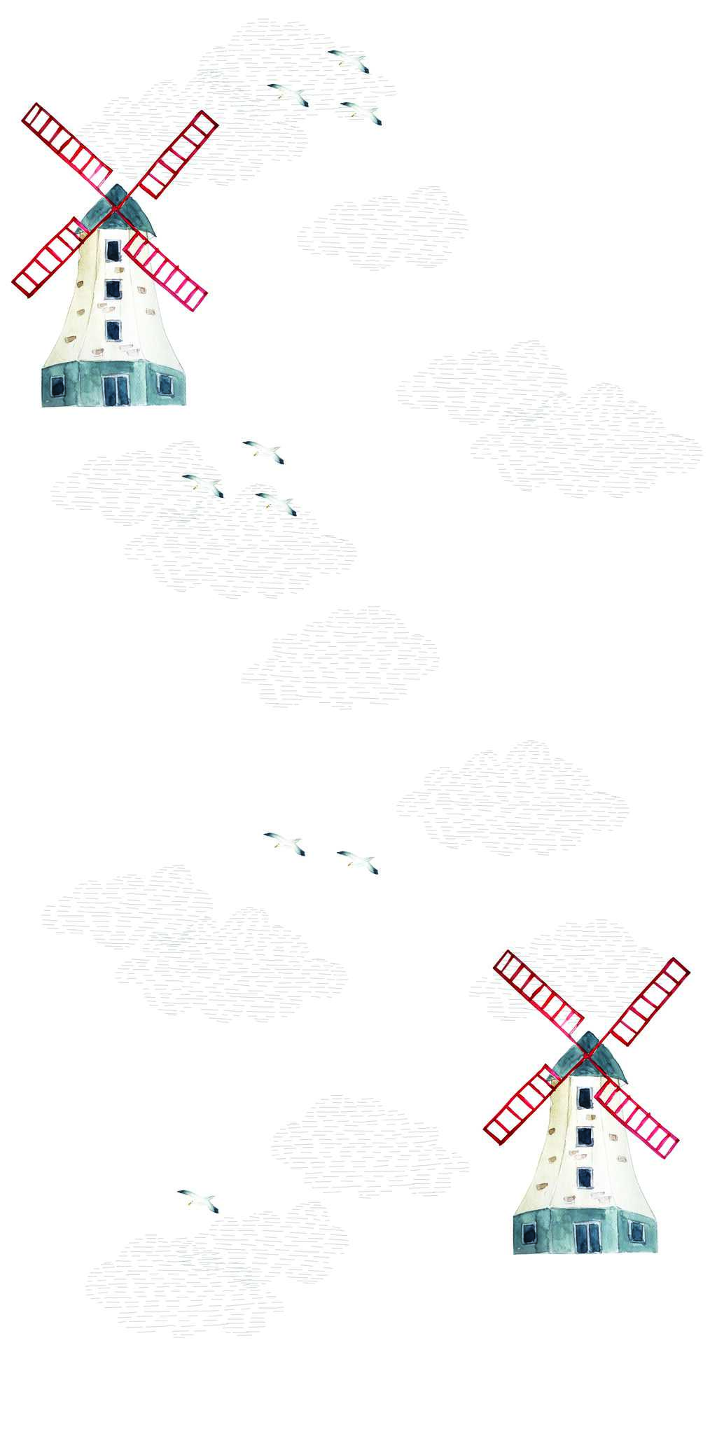 Tapeta nadmorska – młyn, mewy i chmury – w rolce