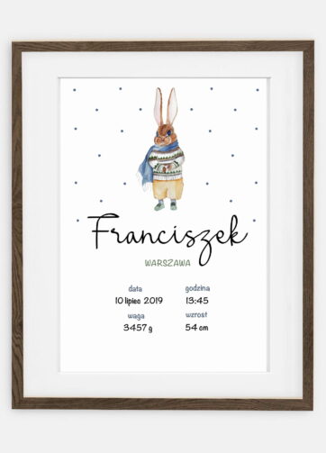 Każda metryczka z króliczkiem z tej kolekcji to małe arcydziełko, czerpiące inspirację z dawnego stylu ilustracji. Decydując się na nasze metryczki, otrzymujesz nie tylko śliczną ozdobę dziecięcego pokoju, lecz także pamiątkę najcudowniejszych chwil. Zapraszamy do odkrycia pełnej gamy wzorów metryczek z króliczkami, gdzie każdy motyw opowiada inną, czarującą historię i czeka, by stać się częścią Waszych wspomnień. Wybierz ten, który najbardziej poruszy Twoje serce, spersonalizuj go i stwórz podarunek, który przez długie lata będzie przypominał o magicznym wydarzeniu narodzin.